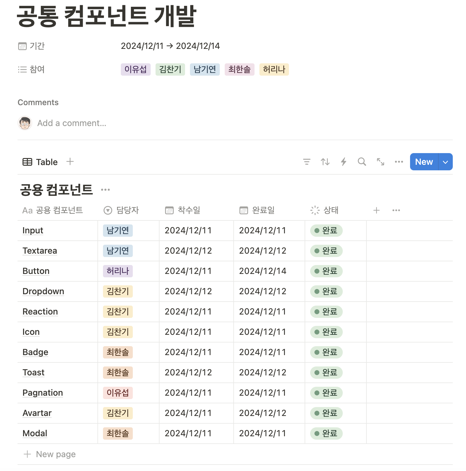 프로젝트가 시작되면서 공용컴포넌트, 페이지 작업등이 팀원들에게 분배가 되었고, 각자 맡은 R&R을 처리하는 과정을 실시간으로 팀원들에게 알려주기 위해 노션에서 작업상황을 관리하게 되었습니다. 처음 하는 협업프로젝트임을 감안하여 최대한 작업파일이 겹치지 않게 작업을 분배해 큰 충돌해결 없이 프로젝트가 잘 진행되었습니다.
