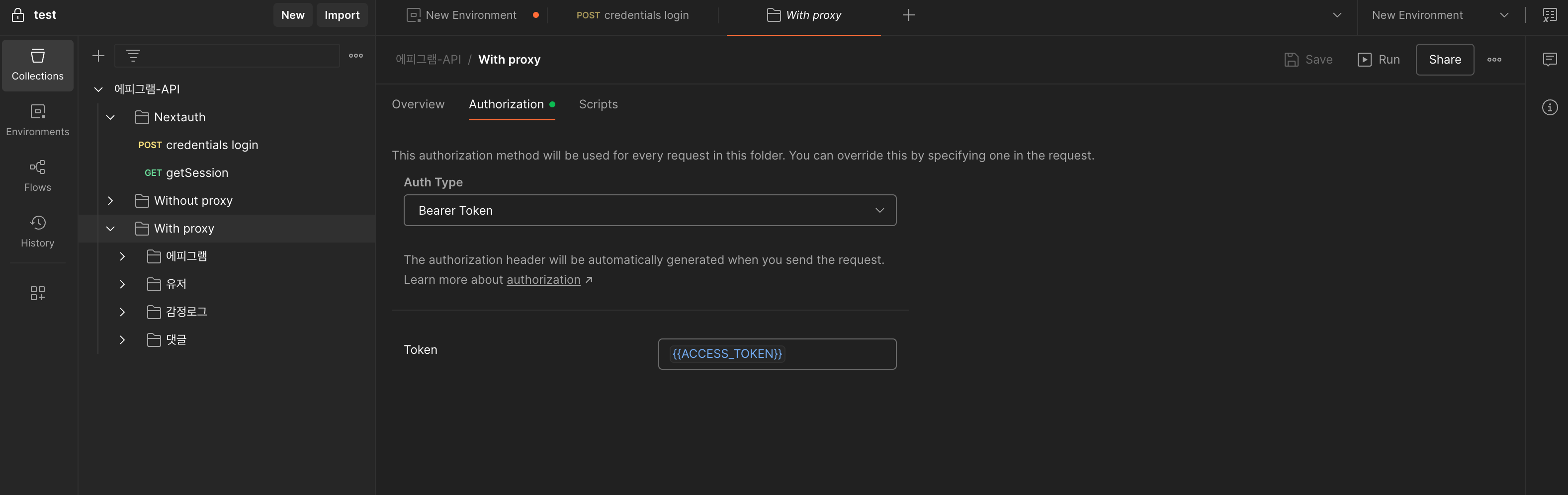 이제 사용하고 싶은 api request 탭에서 직접 이 토큰을 활용하거나, 폴더로 하나로 감싼후에 공통된 header 옵션을 상속하도록 해서 api 요청을 보내면 됩니다.