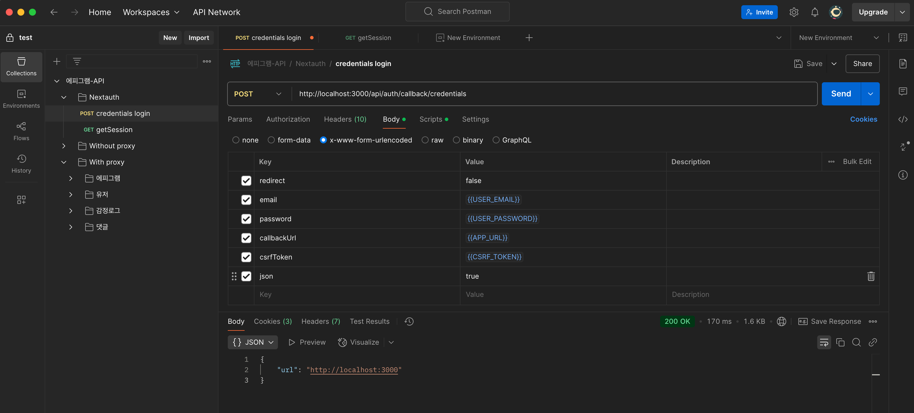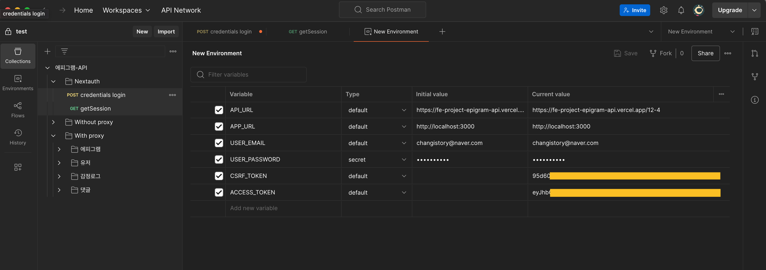 (credentials sigin 요청 전에는 csrf token 환경변수가 빨갛게 세팅이 안되어있지만, send버튼을 눌러 로그인 요청을 하게 되면 pre-request의 내용을 진행하여 csrf token을 환경변수 세팅 후 (파랗게 변함) 로그인 요청을 보내게 됩니다.)