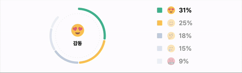 감정 차트 컴포넌트는 Chart.js를 커스터마이징하여 도넛 형태의 차트로 구현하였습니다. 단순히 데이터를 내부에서 처리하는 방식이 아닌, 외부에서 데이터를 주입받아 렌더링하는 구조로 설계함으로써 컴포넌트의 재사용성과 테스트 용이성을 높였습니다.