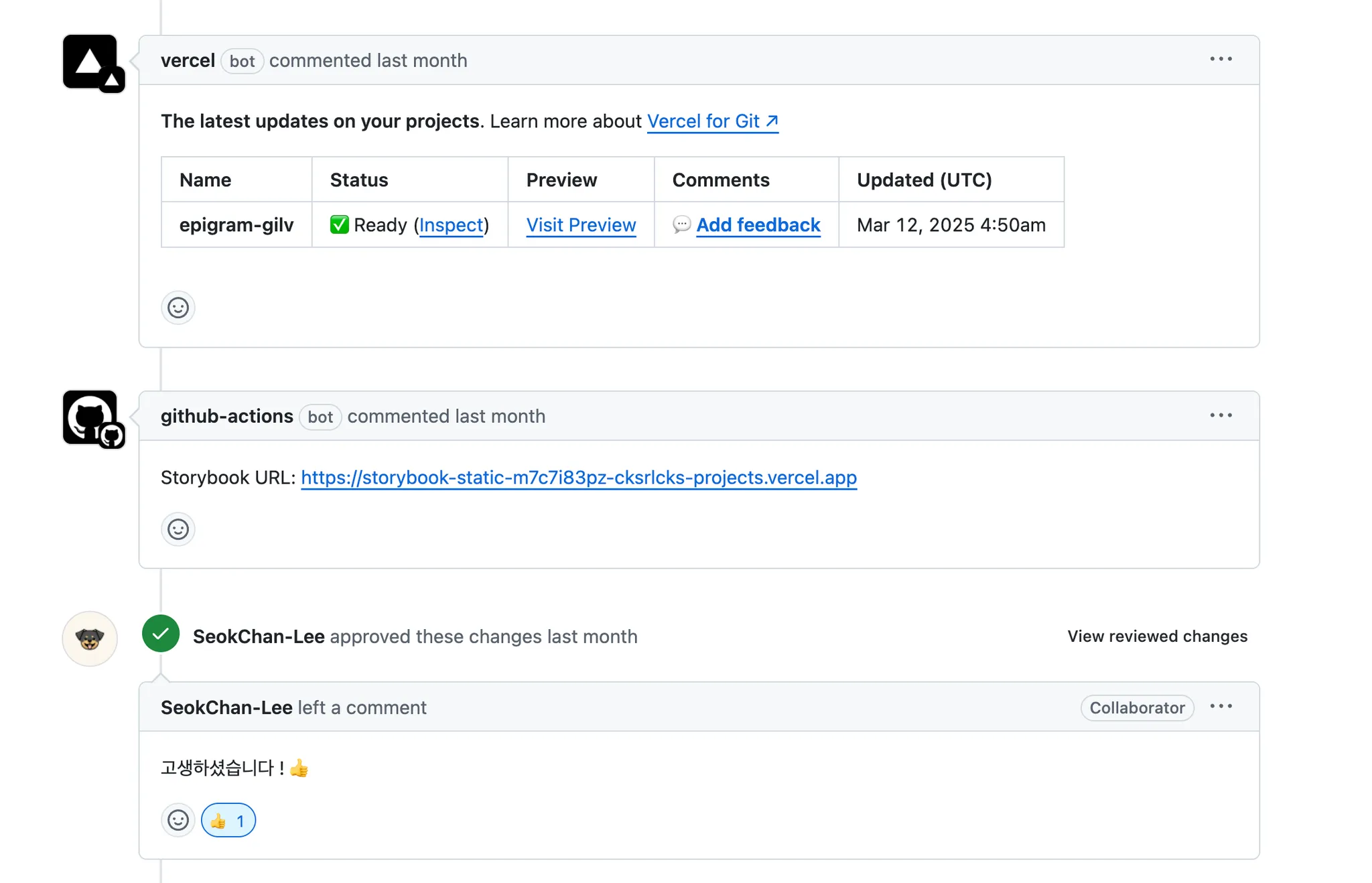 PR이 제출되거나 main 브랜치에 머지될 때마다, 자동으로 Storybook 프리뷰 링크가 생성되도록 GitHub Actions를 설정하였습니다. 이를 통해 각 컴포넌트의 구현 결과를 쉽게 확인하고, 빠르게 리뷰할 수 있는 개발 흐름을 만들 수 있었습니다.