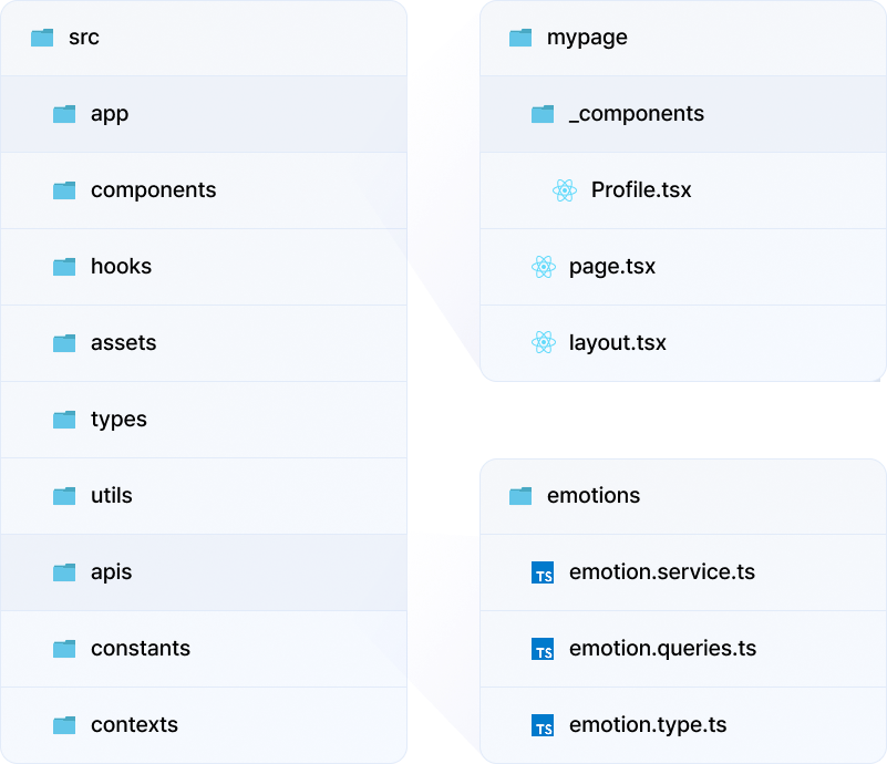 프로젝트 진행에 앞서, 팀원들과 함께 유지 보수성과 협업 효율성을 높이기 위한 폴더 구조에 대해 충분히 논의하였습니다. 그 결과, 기능과 목적에 따라 역할별로 명확히 구분된 구조를 설계하였고, 각자의 작업 범위가 명확해짐에 따라 개발 과정에서도 보다 원활한 협업이 가능했습니다.
