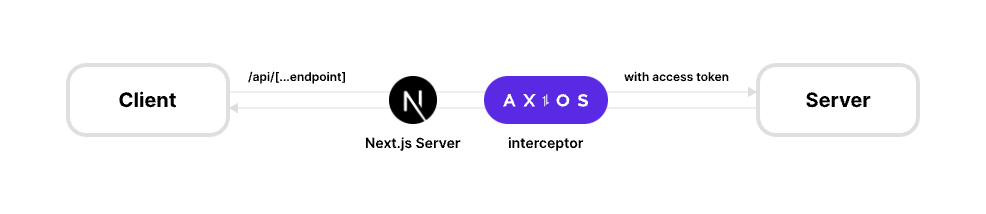 백엔드 API 호출 시에는 Next.js의 catch-all segment를 활용하여, 프론트엔드에서 발생하는 API 요청이 먼저 Next.js 서버를 거치도록 구성하였습니다. 이 과정에서 axios의 request interceptor를 사용해 토큰을 자동으로 헤더에 포함시킨 후 백엔드 서버로 요청을 전달하도록 처리하였습니다.