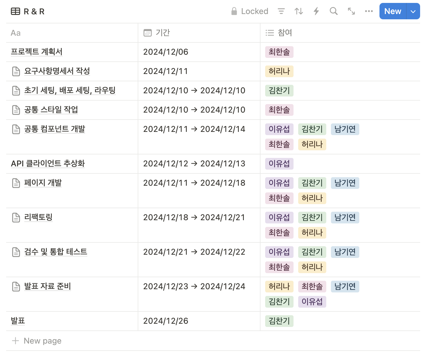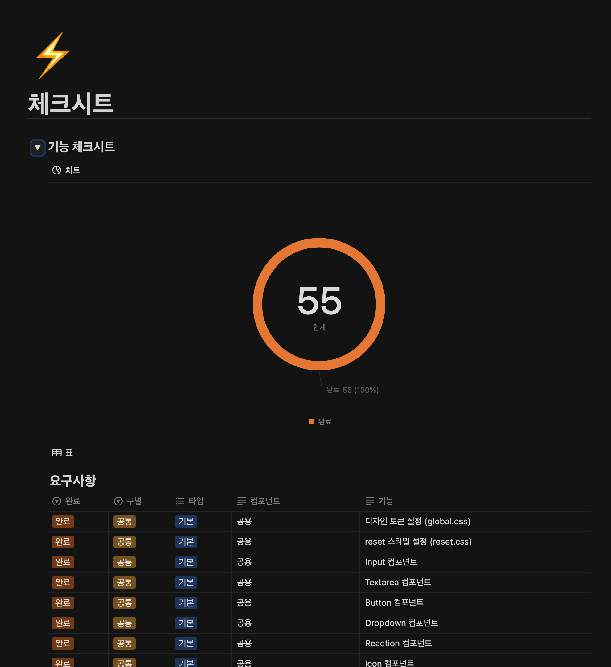 프로젝트가 시작되면서 공용컴포넌트, 페이지 작업등이 팀원들에게 분배가 되었고, 각자 맡은 R&R을 처리하는 과정을 실시간으로 팀원들에게 알려주기 위해 노션에서 작업상황을 관리하게 되었습니다. 처음 하는 협업프로젝트임을 감안하여 최대한 작업파일이 겹치지 않게 작업을 분배해 큰 충돌해결 없이 프로젝트가 잘 진행되었습니다.