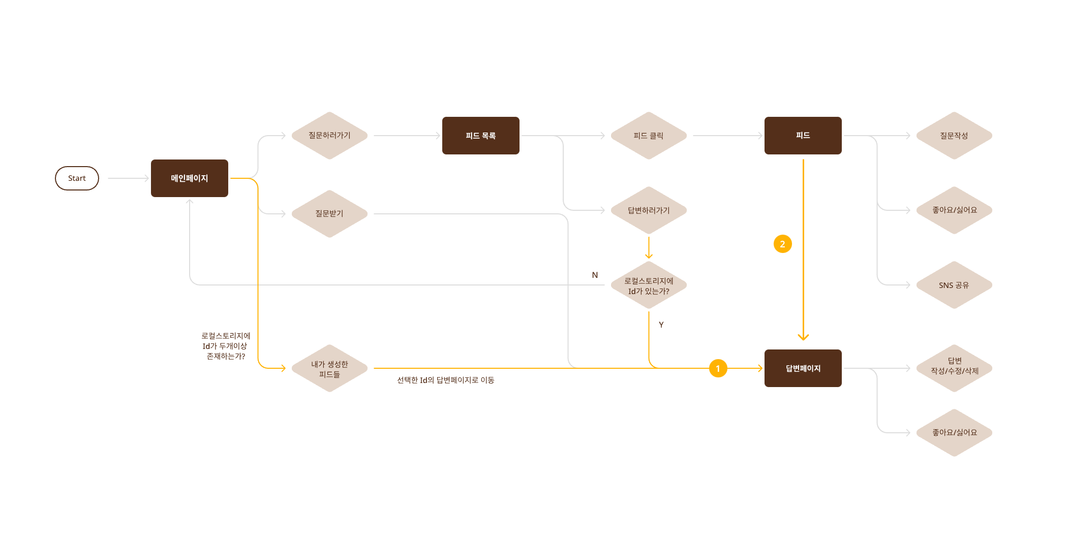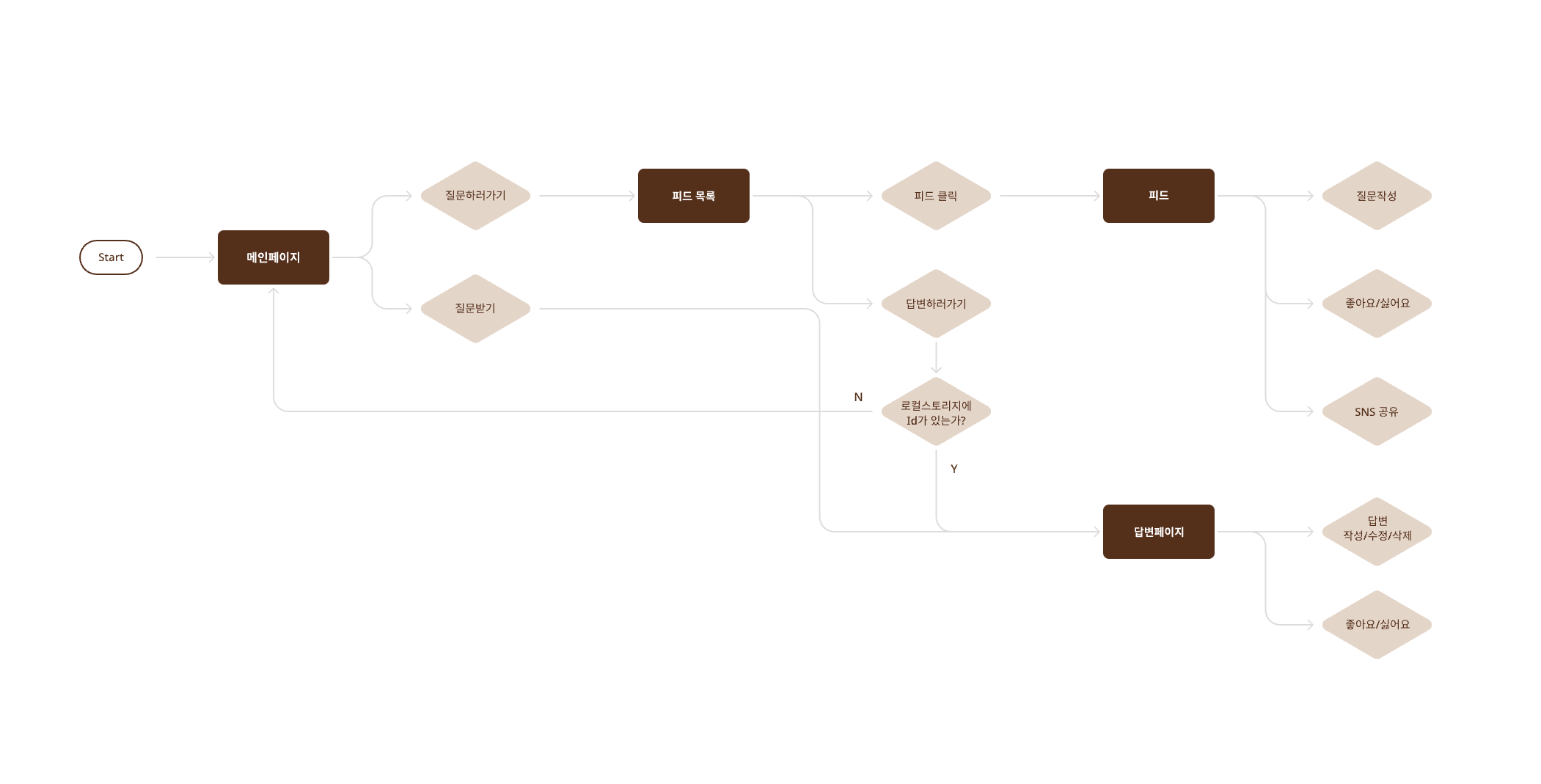 유저플로우를 직접 그려보니 자연스레 질문 작성자 위주로 흘러가는 유저플로우 때문에 정작 이 피드의 작성자가 본인의 피드를 찾아가거나 피드 작성자만 접근가능한 답변페이지로 이동하는 과정이 불편한 점을 알게 되었습니다.